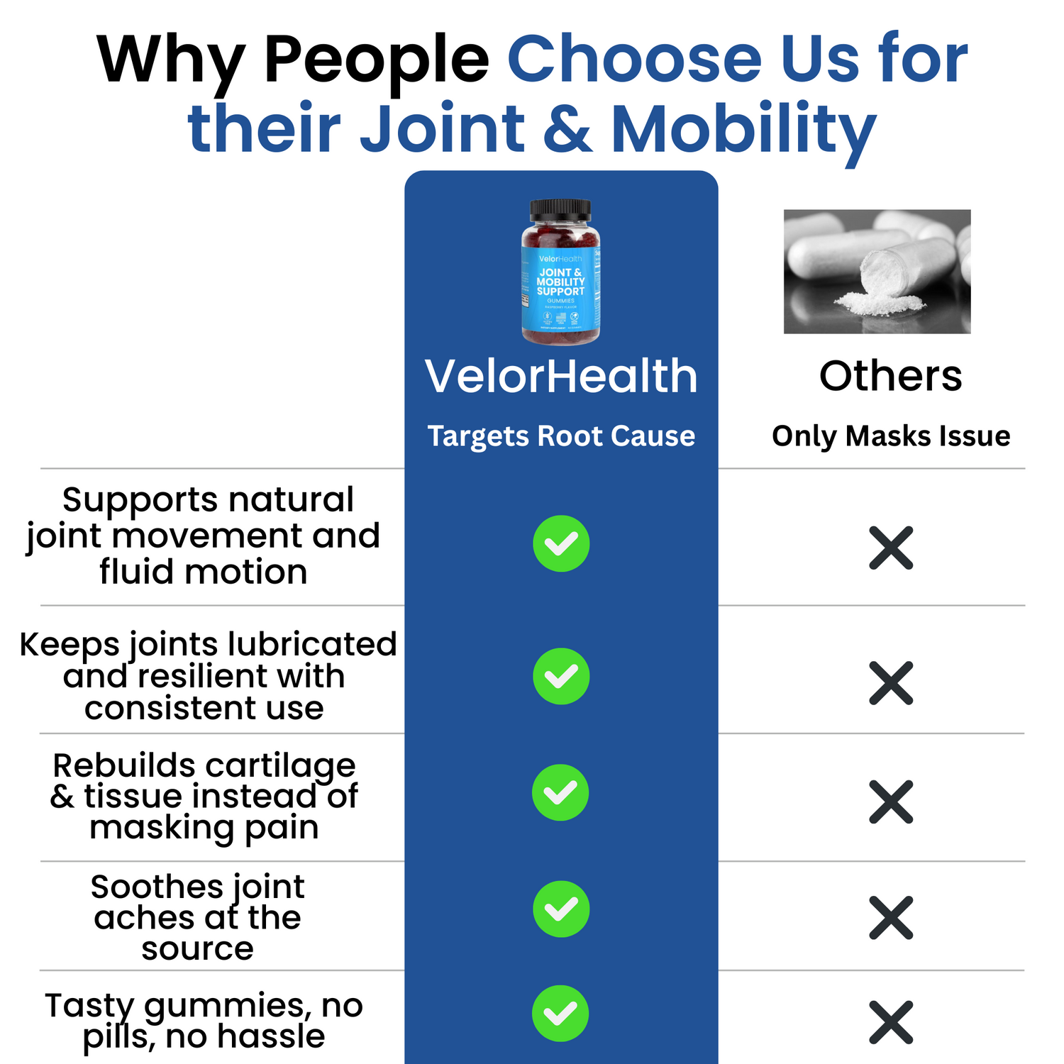 Unlike quick-fix pills or temporary pain relief creams, VelorHealth is designed to repair and protect your joints from the inside out — using ingredients like Glucosamine, Vitamin E, and anti-inflammatory compounds to support long-term mobility.