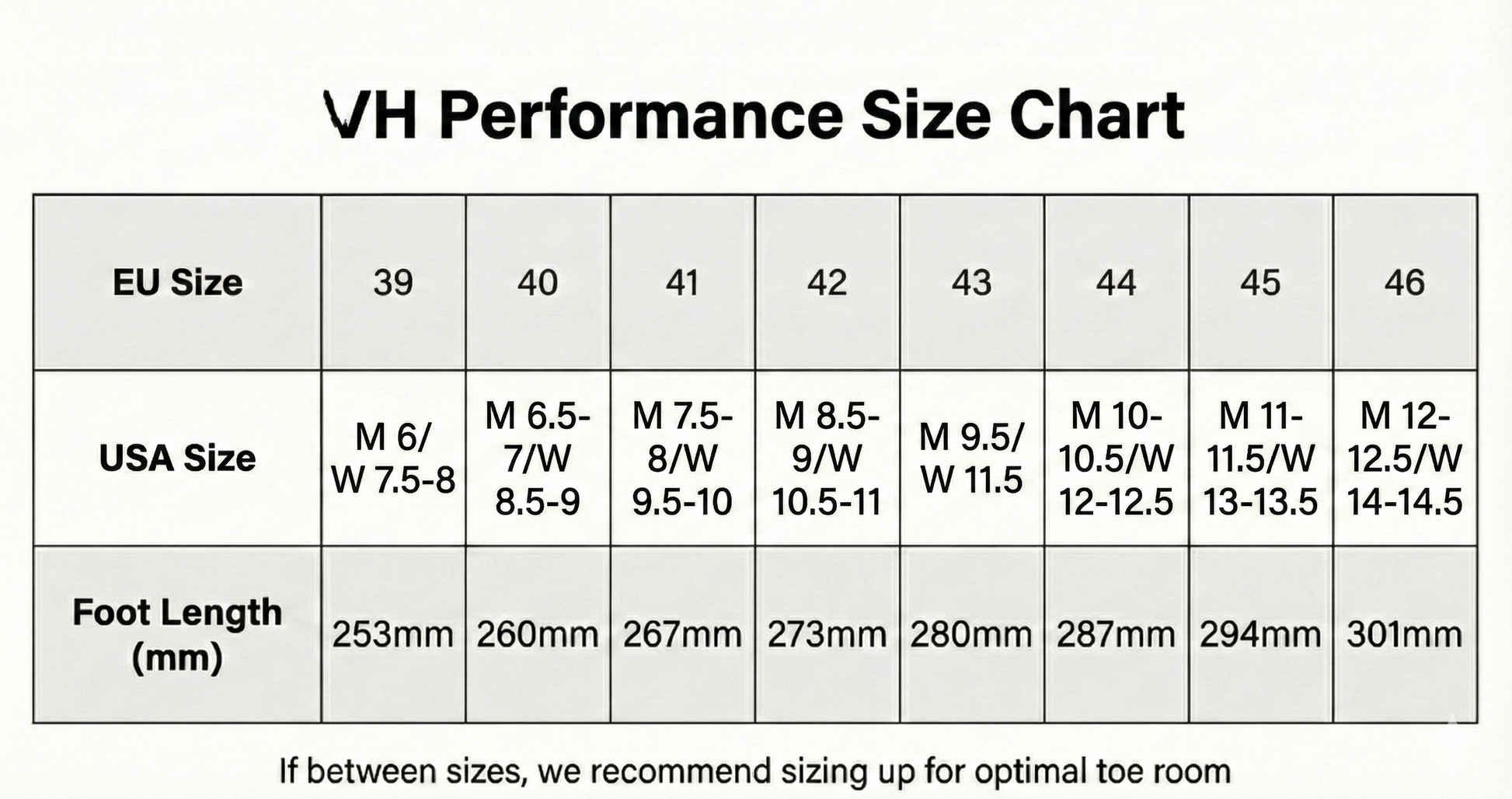VH Performance shoes fit true to size in length, but the toe box is wider to allow your toes to spread naturally. If you're between sizes or have wider feet, size up. Your toes should have room to move without hitting the front. Most customers find the fit more comfortable than traditional shoes once adapted.